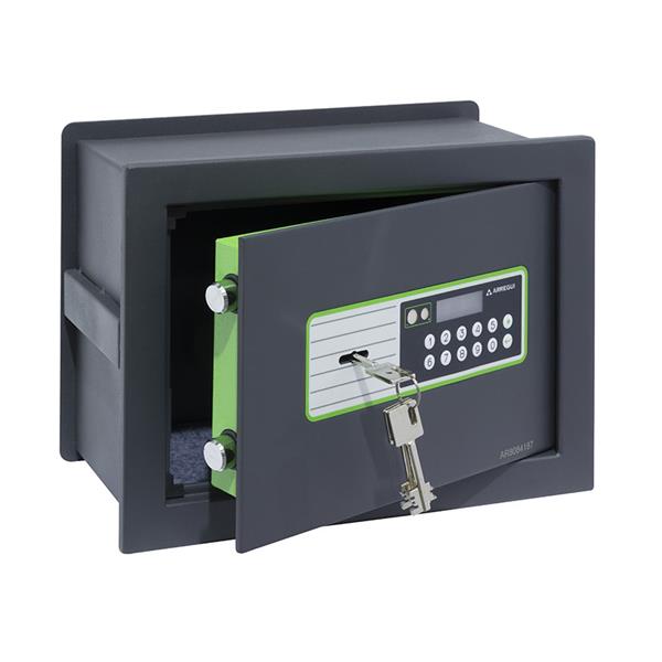 Apertura electrónica+llave. Espesor frente 6 mm y cuerpo 2 mm. Display 6 dígitos. Sistema de bloqueo de apertura por introducción de código erróneo. 2 bulones giratorios ø 20 mm. Volumen 7-16 l. Referencia: 241020. Exterior: 360x150-250xh.260 mm. Interior: 340x90-190xh.240 mm.