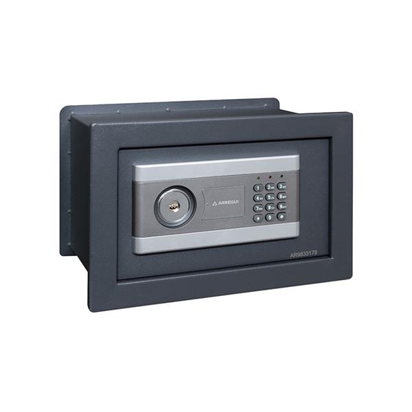 Apertura mediante llave y código numérico. Cuerpo acero 2 mm. Puerta 4 mm. 2 bulones Ø 16 mm. Llave de emergencia. 32x20xh.21 cm.