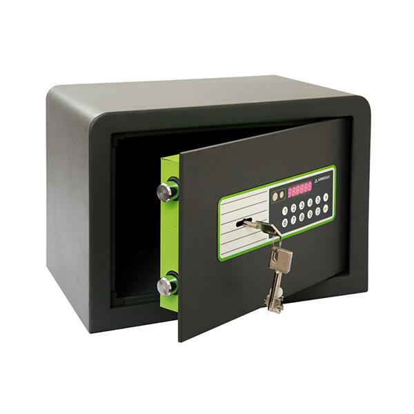 Apertura electrónica + llave. 2 códigos independientes para 2 usuarios. Cuerpo acero 2 mm. Puerta 6 mm. 2 bulones Ø 20 mm. Luz interior. 35x25xh.25 cm