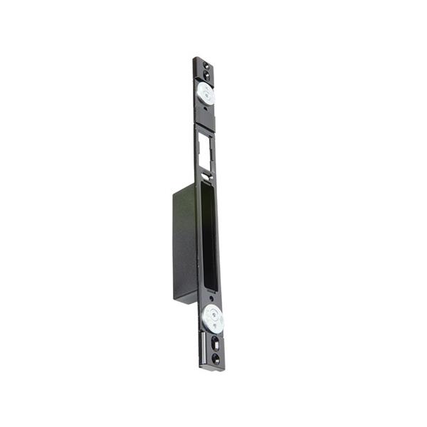 Cerradero metálico regulable. Regulación lateral de 2,5 mm. Para perfiles de cámara Europea. Central. Negro. Inox.