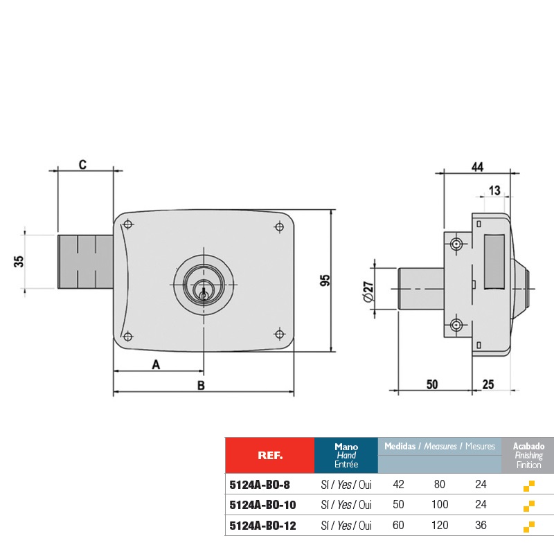 {imagen-envio-gratis-pdf} {imagen-outlet-pdf} {imagen-oferta-pdf} CERRADURA 5124-AHE 12 D Ref: 1840017 EAN: 8422221396007 37.22€IVA incluido Envio en 24/48 horas Calidad y garantía Pago 100% seguro Garantía de devolución {enviar-amigo-pdf} {imprimir-pdf-pdf} Stock: Unidades de caja: 1.00 ¿Necesitas ayuda?967 141 344 Estaremos encantados de atenderte en lo que necesites. características Cilindro redondo Ø 27 mm. Llave sola estriada. Pintada. Derecha. 120 mm.