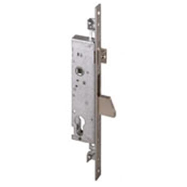 Palanca basculante. Picaporte regulable de 11 a 17 mm. Caja de acero cincado, frente acero inoxidable. Picaporte y palanca niquelados. Sin cerradero y sin cilindro. Entrada 35 mm.