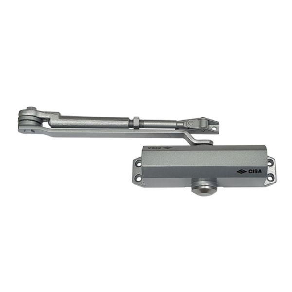 Multifuerza EN 2-4. Velocidad de cierre regulable mediante válvula. Para puertas de ancho máximo 1.100 mm. Con retenedor. Plata.