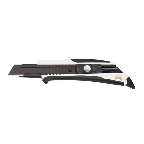 Trabajos duros. Mango acero inox con protección ABS y recubrimiento antideslizante. Punta endurecida (apretar tornillos, abrir botes, etc.) Gancho trasero FIN para abrir y realizar hendidos en cartón. Ancho cuchilla 18 mm. DFC-560. Bloqueo automático.