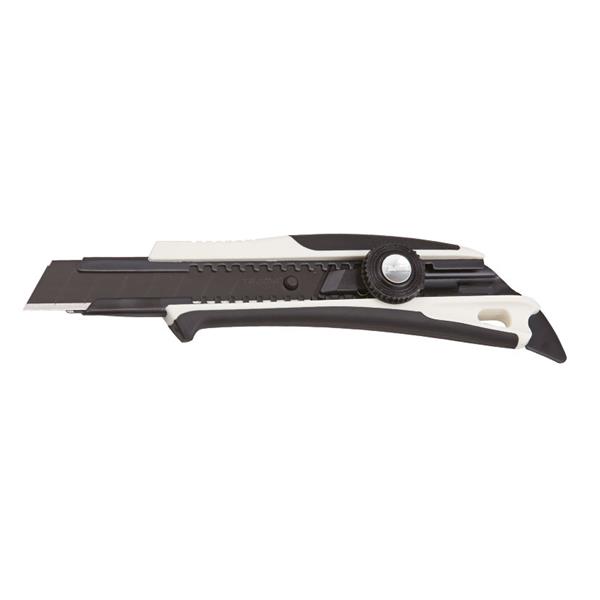 Trabajos duros. Mango acero inox con protección ABS y recubrimiento antideslizante. Punta endurecida (apretar tornillos, abrir botes, etc.) Gancho trasero FIN para abrir y realizar hendidos en cartón. Ancho cuchilla 18 mm. DFC-561. Bloqueo manual.
