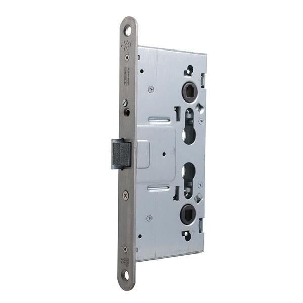 Entrada de 65 mm. Distancia entre ejes de 72 mm. Reversible. Función condena. Picaporte. Frente inoxidable.