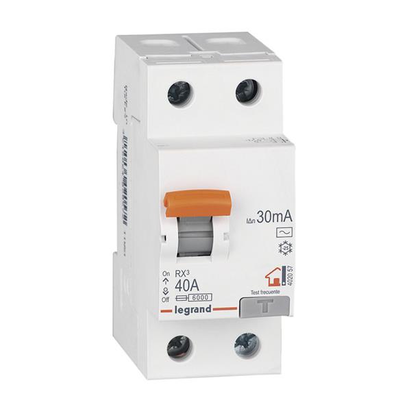 Dispositivo electromecánico que se coloca en las instalaciones eléctricas de corriente alterna, con el fin de proteger a las personas de las derivaciones causadas por faltas de aislamiento entre los conductores activos y tierra o masa de los aparatos. 2P 25 A. 30 mA.
