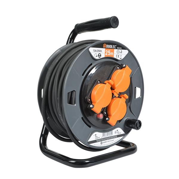 3 tomas con tapa, T/T lateral. Cable H05RR-F 3G1,5. Interruptor de protección térmica. Potencia máxima admisible cable desenrollado 3.000 W. Cable enrrollado 1.000 W. Tensión 13A/230V. Carrete de plásticp. Soporte metálico. 25 m.