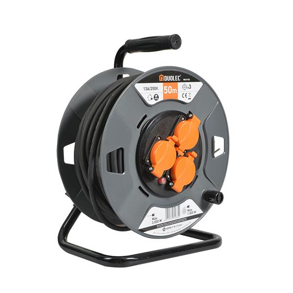 3 tomas con tapa, T/T lateral. Cable H05RR-F 3G1,5. Interruptor de protección térmica. Potencia máxima admisible cable desenrollado 3.000 W. Cable enrrollado 1.000 W. Tensión 13A/230V. Carrete de plástico. Soporte metálico. 50 m.