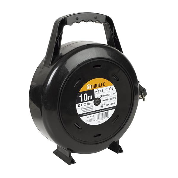 4 tomas T/T lateral. Cable H05VV-F 3G1.5. Interruptor de protección térmica. Potencia máxima admisible cable desenrollado 3.680 W. Cable enrollado 1.000 W. Tensión 16A/250V. 10 m.