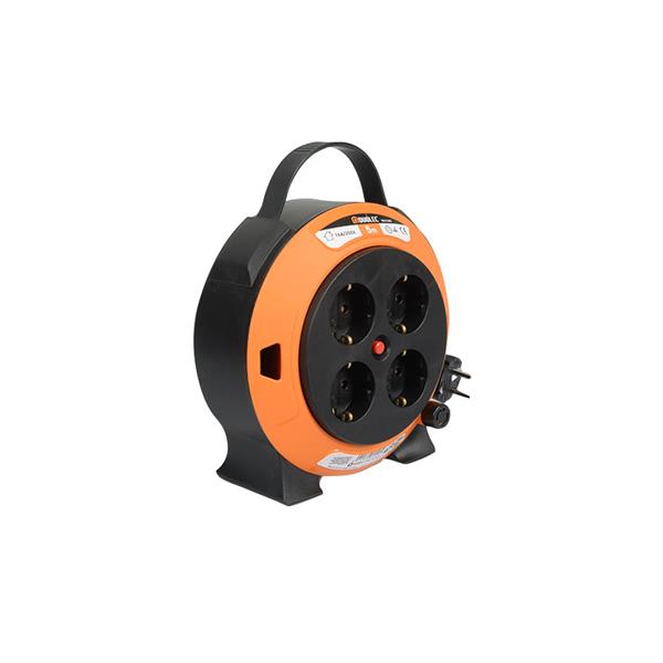 4 tomas T/T lateral. Cable HO5VV-FF 3G1.5. Interruptor de protección térmica. Potencia máxima admisible cable desenrollado 1.000 W. Tensión 16A/250V. 5 m.