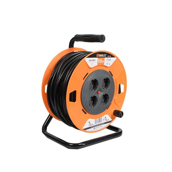 4 tomas T/T lateral. Cable H05VV-F 3G1.5. Interruptor de protección térmica. Potencia máxima admisible cable desenrollado 3.000 W. Cable enrollado 1.000 W. Tensión 16A/250V. Protección infantil. Tirador extensible. Placa para fijar el carrete durante el transporte. IP20. 50 m.