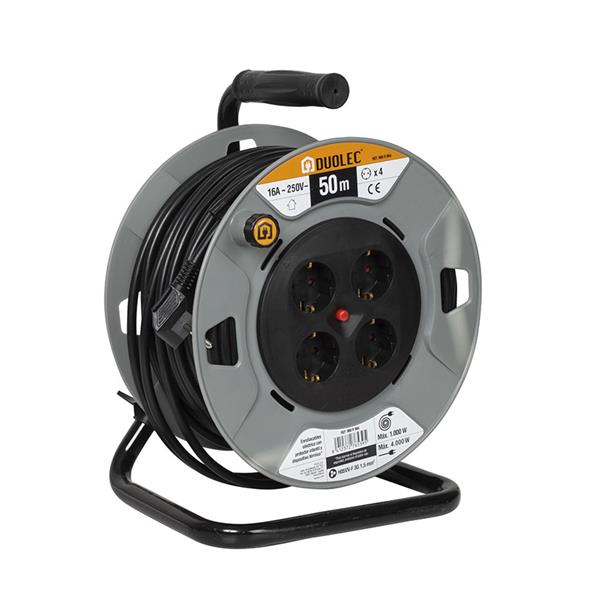 4 tomas T/T lateral. Cable H05VV-F 3G1.5. Interruptor de proteccion térmica. Potencia máxima admisible cable desenrollado 4.000 W. Cable enrollado 1.000 W. Tensión 16A/250V. Protección infantil. Guía para facilitar el enrollado. Tirador extensible. P 50 m.