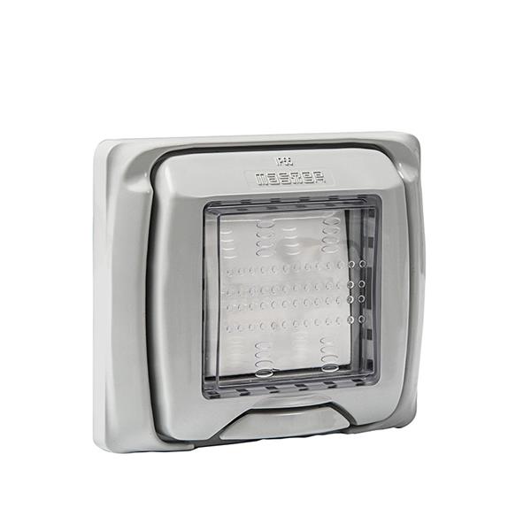 La cubierta transparente con protección IP55 garantiza un sellado eficaz en exteriores,. ofreciendo un diseño versátil que se adapta a todo tipo de entornos. Pulsador.