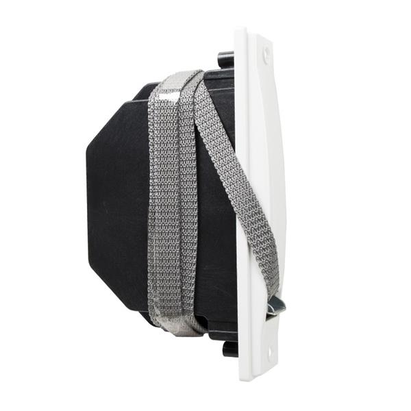 Cajetín con pivote y recogedor de empotrar. Compacto con cinta 14 mm. Placa blanca. Cinta gris.