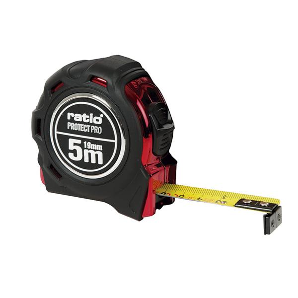 ABS con recubrimiento antideslizante. Cinta numeración doble cara (amarilla/blanca) con revestimiento nylon antireflex. Gancho reforzado y magnético. Clip para cinturón y botón de bloqueo. Homologado CE. Clase de Precisión II. 5 metros. Cinta 19 mm.