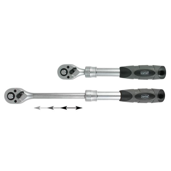Carraca reversible 72 dientes. Acero cromo-vanadio satinado. Sistema de bloqueo y expulsor Locksystem. Anilla de seguridad. Empuñadura ergonómica deslizante. 1/2 x 300-445 mm.