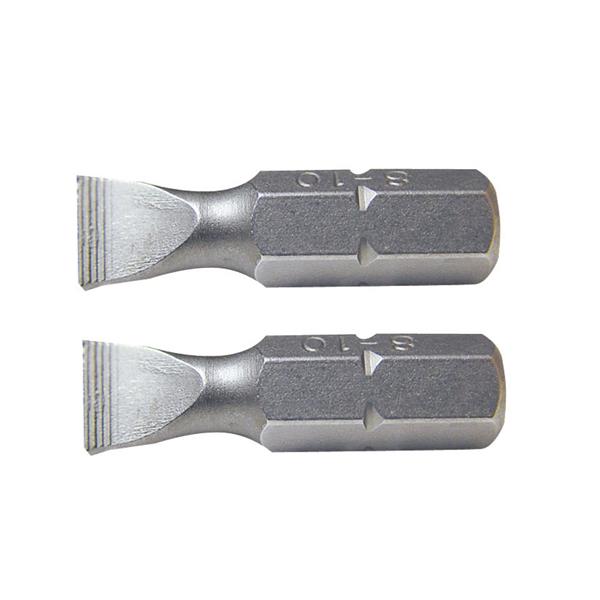 Puntas 25 mm. Hexágono 6,35 mm. Acero cromo-vanadio S2. Dureza 59 - 61 HRc. DIN 3126. Blister 2 puntas. Plana 0,6 x 4,5 mm