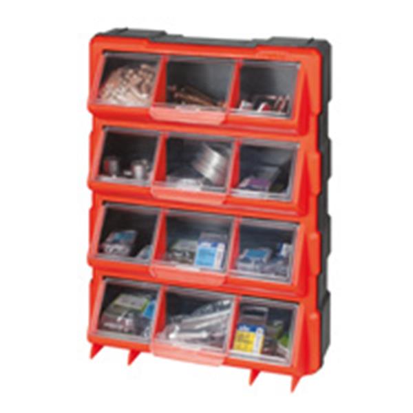 Estructura poliestireno de alto impacto. Cajones polipropileno transparente. Módulo apilables entre si mismos. Sistema de fijación a pared. 38,5x16xh.48,5 cm. 30 cajones pequeños / 9 cajones medianos. Cajones con separador amovible.