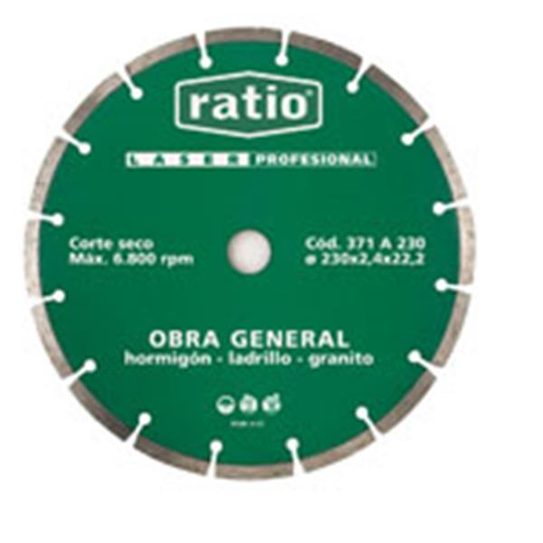 {imagen-envio-gratis-pdf} {imagen-outlet-pdf} {imagen-oferta-pdf} DISCO DIAMANTE SEGMENTADO OBRA Profesional 230mm Ratio Ref: 371A230 EAN: 8412372168660 48.23€IVA incluido Envio en 24/48 horas Calidad y garantía Pago 100% seguro Garantía de devolución {enviar-amigo-pdf} {imprimir-pdf-pdf} Stock: Unidades de caja: 1.00 ¿Necesitas ayuda?967 141 344 Estaremos encantados de atenderte en lo que necesites. características Láser segmentado. Obra general, hormigón, ladrillo, granito. 230 x 2,4 x 22,2 mm