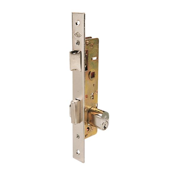 Golpe y llave. Cilindro ovalado con vástagos, reversible (la llave acciona el golpe). Frente niquelado. Entrada 20 mm.
