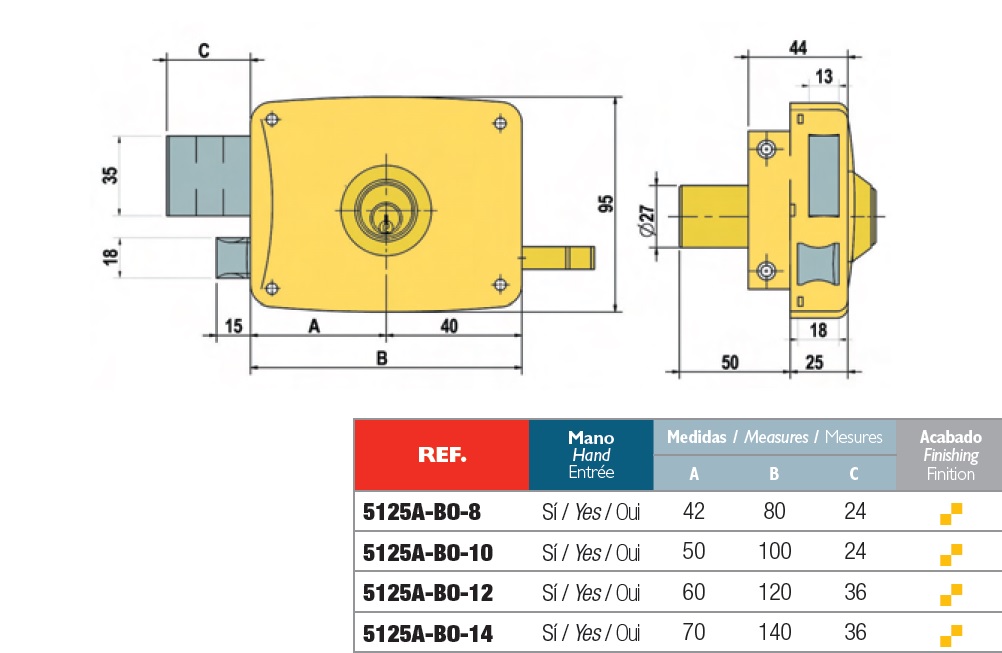 {imagen-envio-gratis-pdf} {imagen-outlet-pdf} {imagen-oferta-pdf} CERRADURA 5125-AHE 08 D Ref: 1840019 EAN: 8422221400001 37.73€IVA incluido Envio en 24/48 horas Calidad y garantía Pago 100% seguro Garantía de devolución {enviar-amigo-pdf} {imprimir-pdf-pdf} Stock: Unidades de caja: 1.00 ¿Necesitas ayuda?967 141 344 Estaremos encantados de atenderte en lo que necesites. características Cilindro redondo Ø 27 mm. Golpe y llave estriada. Pintada. Derecha. 80 mm.