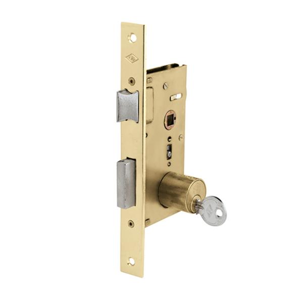 Golpe y llave. Cilindro de vástagos redondos, reversible, frentre latonado. Entrada 50 mm.