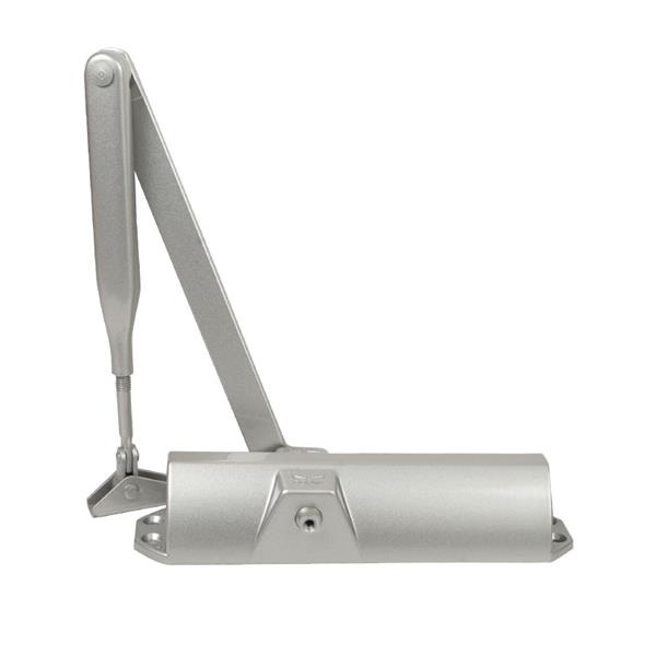 Mecanismo piñon-cremallera con brazo. Fuerza regulable EN 2-3-4. Anchura puertas hasta 110 mm. Puertas hasta 60 kg. Sin retenedor. Plata.