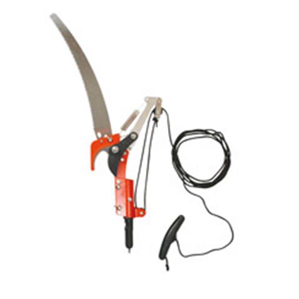 Cuchilla teflonada de acero con tratamiento térmico. Longitud cuerda 3 m. Sistema desmultiplicación de fuerza. Serrucho diente universal 30 cm. Conexión a mangos intercambiables de aluminio. Tijera Ø corte 20 mm.