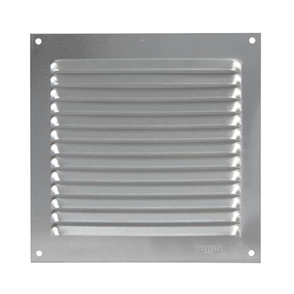 Aluminio. Grosor plancha 0,8 mm. Sin pestaña lateral. Uso dom Anodizado plata. Con mosquitera. 17x17 cm. Paso de aire 75 cm².