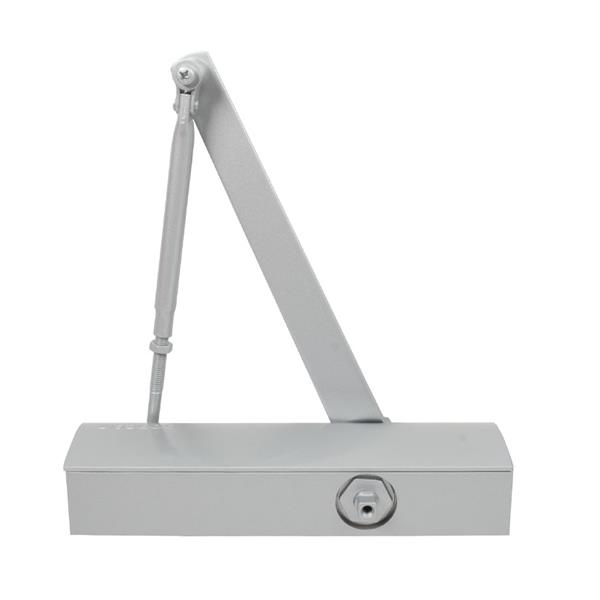 Fuerza y velocidades de cierre ajustables. Fuerza EN 2-5. Puertas de 25 a 85 kg. Anchura puertas de 850 a 1.100 mm. Certificado CE puertas cortafuego. Cuerpo de aluminio y brazo de acero. Sin retenedor. Plata