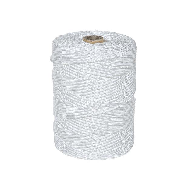 Bobina. Color blanco. 100% polipropileno alta tenacidad con protección UV. Trenzado con alma. Aplicaciones: Riel de cortinas, tenderos, camping, guía hilos. ø 2,5 mm x 100m.