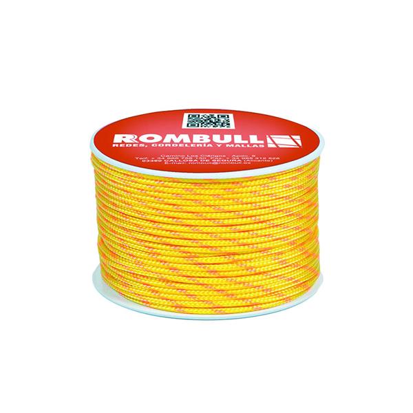 Bobina. Camisa poliéster alta tenacidad, interior material textil trenzada con alma. Cordón con mucha variedad de colores, flexibles, muy suaves y con gran resistencia. Aplicaciones: Decoración, juguetería, trabajos manuales,pulseras, pancartas, bricolaje. ø 2,5 mm x 60 m. Amarillo.