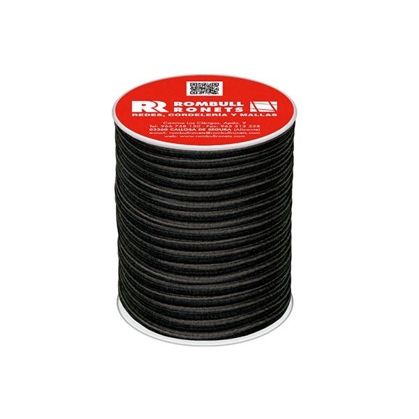 Camisa en polipropileno y poliéster dependiendo del color, interior látex. Trenzado con alma. Aplicaciones: Sujeción de paquetes en superficies móviles, redes de contenedor, industria del automóvil, toldos, pancartas, náutica. ø 6 mm x 25 m. Negro.