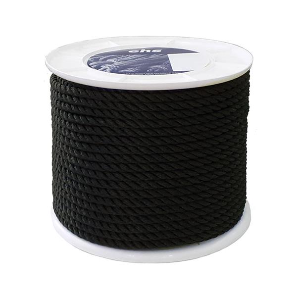 Cuerda compuesta de camisa trenzada y alma de cordón trenzado. Compuesto anti-UVA. Color flúor. Aplicaciones: deportes, seguridad náutica, driza mayor para barcos, etc. Bobinas. ø 10 mm x 100 m. Negro.