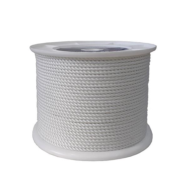 Cuerda compuesta de camisa trenzada y alma de cordón trenzado. Compuesto anti-UVA. Color flúor. Aplicaciones: deportes, seguridad náutica, driza mayor para barcos, etc. Bobinas. ø 6 mm x 100 m. Blanco.