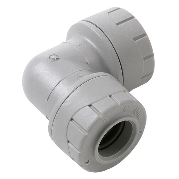 Material plástico de gran flexibilidad, elevada resistencia al calor, baja deformación y menor dilatación térmica lineal. No necesita herramientas. Sistema de unión seguro. Adecuado instalaciones empotradas o a la vista de fontanería (agua fría y cal Codo H-H. ø 15-90º.