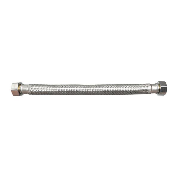 (Latiguillo). Tubo caucho sintético, trenzado con hilos de acero inoxidable. Racor latón niquelado ø 13 mm. M-H. 1/2. 25 cm.