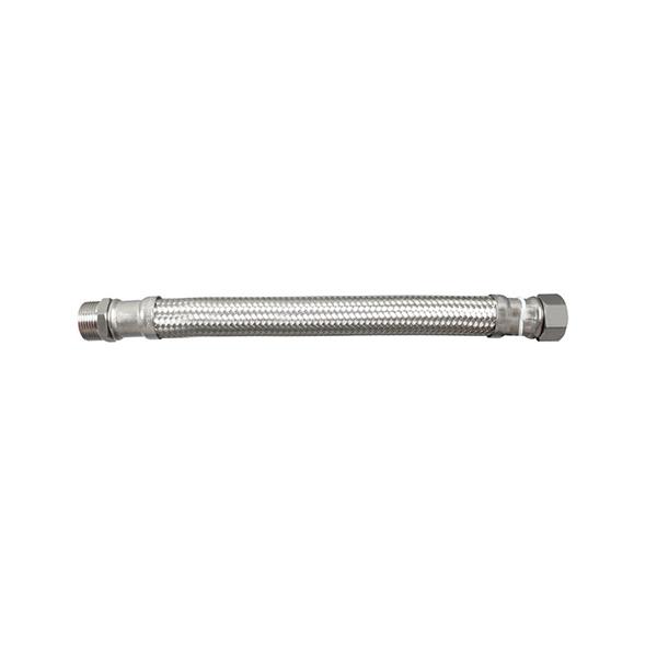 (Latiguillo). Tubo caucho sintético, trenzado con hilos de acero inoxidable. Racor latón niquelado ø 13 mm. M-H. 3/4. 40 cm.
