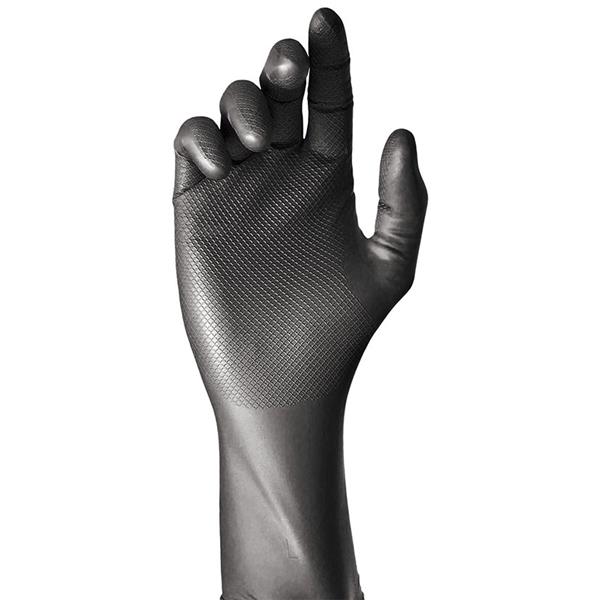 Guante desechable nitrilo sin polvo. Color negro. Ambidiestro. Espesor: 0,15 mm. Largo: 24 cm. Usos: talleres automoción, mecánica en general, etc. Se sirven en cajas con 50 unid. Talla 10. 50 unid.