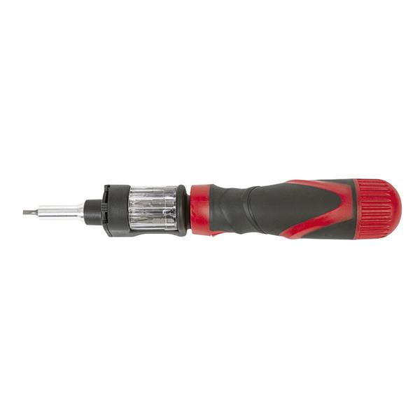 Mango ergonómico antideslizante con sistema de carga automática de puntas. Carraca reversible de 18 dientes. 12 puntas atornillado acero S2 (en dos cartuchos de 6 puntas cada uno). Cartucho principal: Ph1 / Ph2 / Ph3 y Bocas planas: 3 mm/4 mm/5 mm. S Dimensiones: 245x40 mm.
