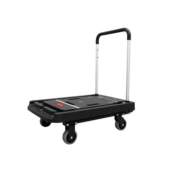 Carretilla de mano con plataforma plegable de aluminio y 4 ruedas plegables. Materiales: polipropileno, aluminio y ruedas de goma sinténtica TPR. Multifución 2 en 1 (plataforma rodante con asa y plataforma con asa plegada de 4 ruedas). Peso máximo 200 kg. Abierto: 80x52x87 cm. Plegado: 80x52x10 cm. Peso: 12 kg.