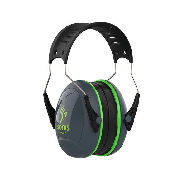 Cinta sobremoldeada. Carcasas de ABS, Almohadillas de combinación de espuma y Tereftalato de poli- etileno PET, Rejilla de acero inoxidable, Diadema de TPE. Color Gris oscuro/ verde. Norma de seguridad EN 352-1. SNR 26, para cascos.