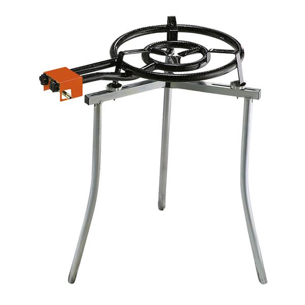 Uso gas butano y propano. Agujeros superiores. Mandos aluminio. Trípode soporte univ. plegable. Regulable en altura p/quemador ø 30-60 cm.