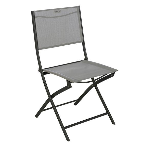 Grafito. Estructura tratada con epoxi antioxidante. Producto tratado contra la decoloración. Producto plegable, fácil de guardar y perfecto para espacios reducidos. Se sostiene en posición vertical plegada y fácil de almacenar. Silla: 52x46xh.99 cm. Asiento h. 42/46 cm. Plegada: 46x6xh.100 cm.