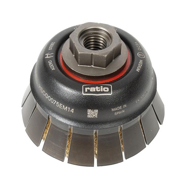 Alambre ondulado. Acero latonado. Casquillo roscado M14. Para óxidos, pinturas y adherencias. ø 75 mm. ø púas 0,30 mm. Máx. 13.000 rpm. Acabado medio (W2).