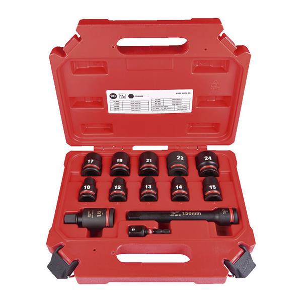 Fabricado en aleaci?n de acero Cromo-molibdeno. Vasos con 6 puntos de contacto para mejor transmision. Estuche de 13 piezas vasos cortos 1/2". Composici?n: 10-12-13-14-15-17 -19-21-22-24 mm, card?n de impacto 15?, adaptador de ?" Hex a cuadradillo de ?", extensi?n 150 mm.