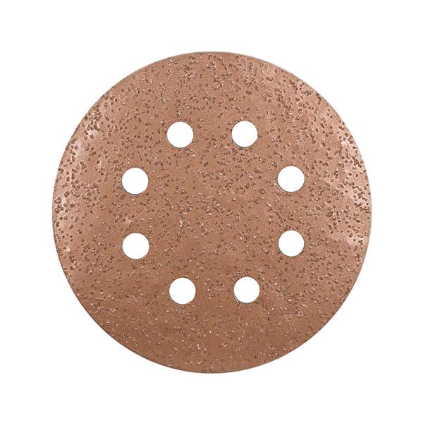 Disco tugsteno de 8 agujeros, y autoadherente. Alto aranque de viruta para superficies duras. ø 125 mm. Grano 36.