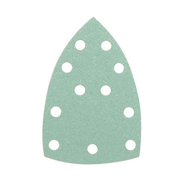 Autoadherente.. Composición:. - Soporte: Papel semilátex y unión de resina.. - Grano: Óxido de aluminio.. - Resvesimiento: Abierto.. Acabado: Sobre espuma. Juego 5 unid. 11 agujeros.. Reduce el embozamiento. 100x150 mm. Grano 180.