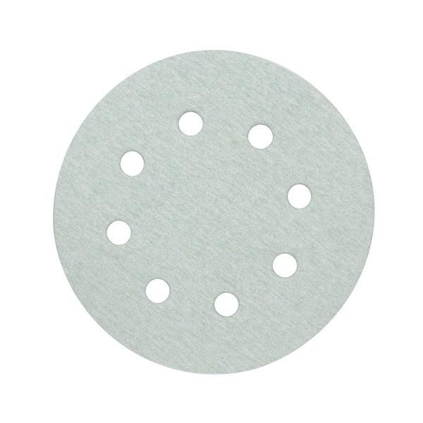 Autoadherente .. Composición:. - Soporte: Papel semilátex y unión de resina.. - Grano: Óxido de aluminio.. - Revestimiento: abierto.. Acabado: Sobre espuma. Juego 5 unidades. 8 agujeros.. Reduce el embozamiento. ø 115 mm. Grano 40. 5 unid.